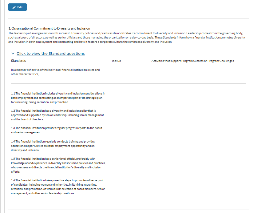 Financial Institution Diversity Self-Assessment Screen Shots