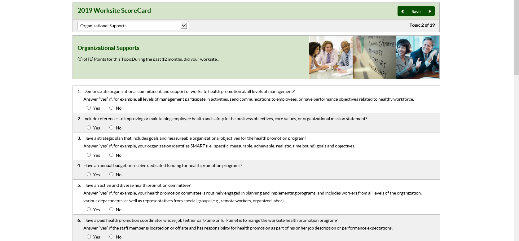 We recommend that you form a small team, representing different organizational units to complete this survey together. A team-based approach will allow for more accurate responses, increase ownership and involvement amongst the team, and decrease effort for any single team member. Since a strong knowledge of your organization and its health promotion program(s) is recommended to accurately complete the tool, strive to pick team members who occupy the following positions: