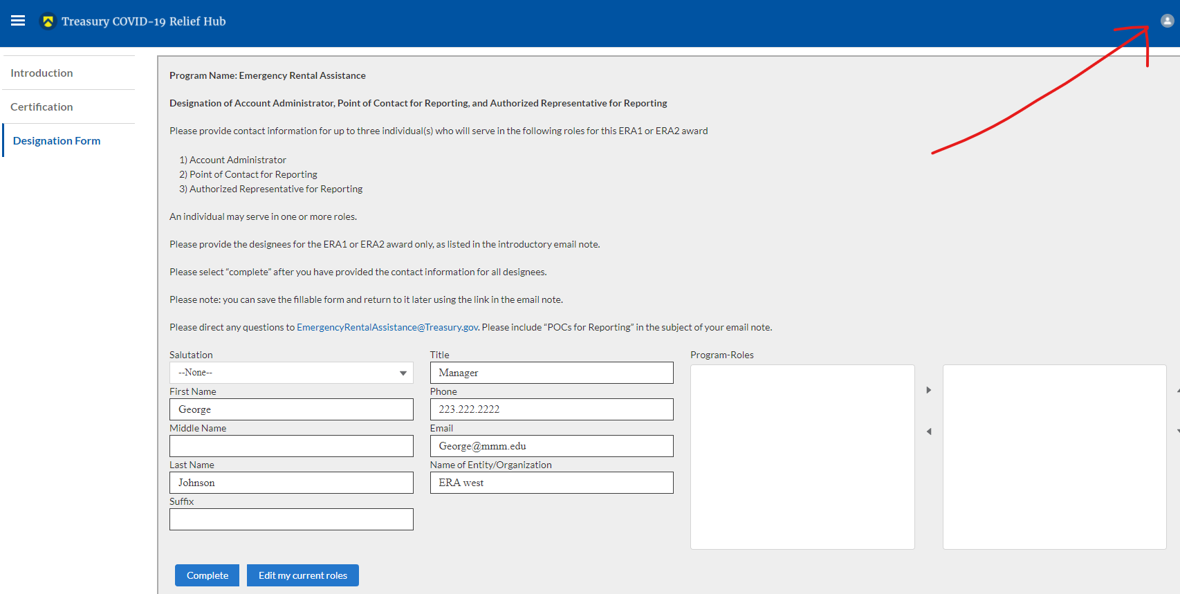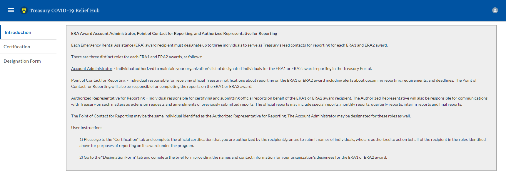 An individual may be designated for multiple roles. For example, the individual designated as the Point of Contact for Reporting may also be designated as the Authorized Representative for Reporting.