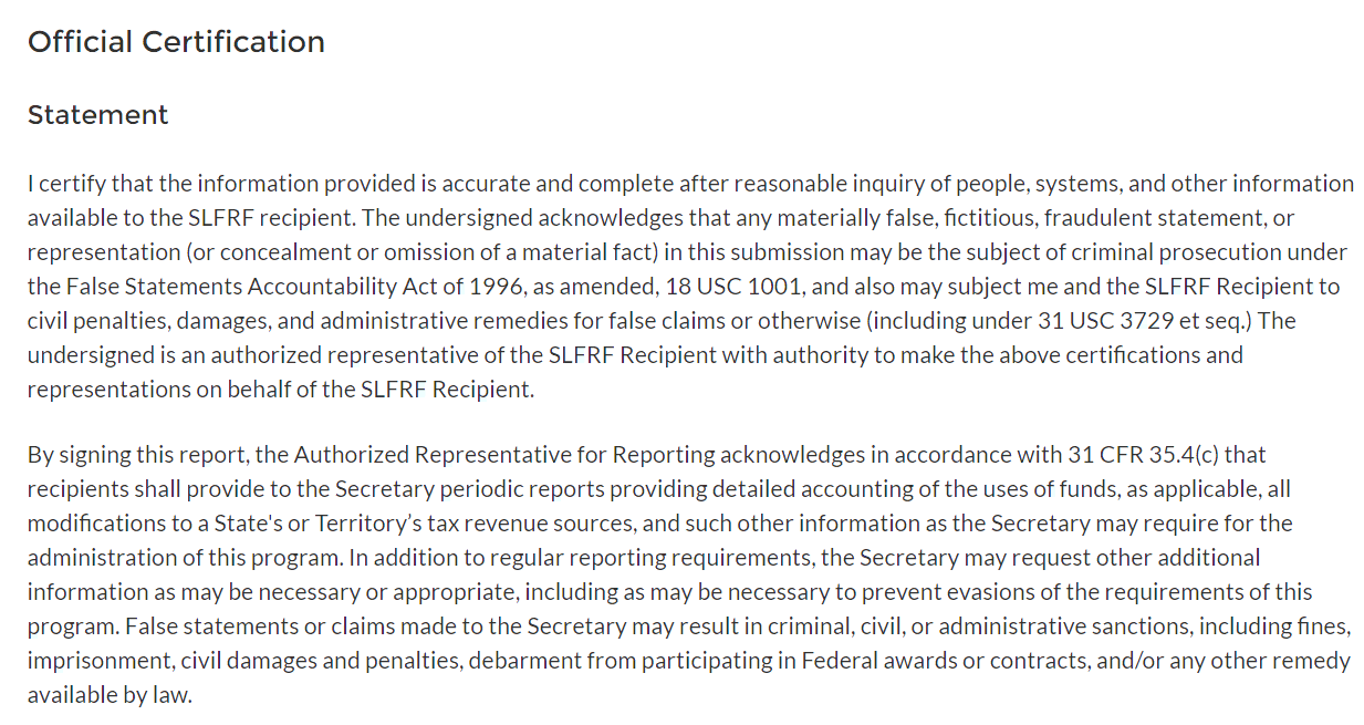 These requirements are further detailed in the guidance on reporting requirements for the Fiscal Recovery Funds available here.