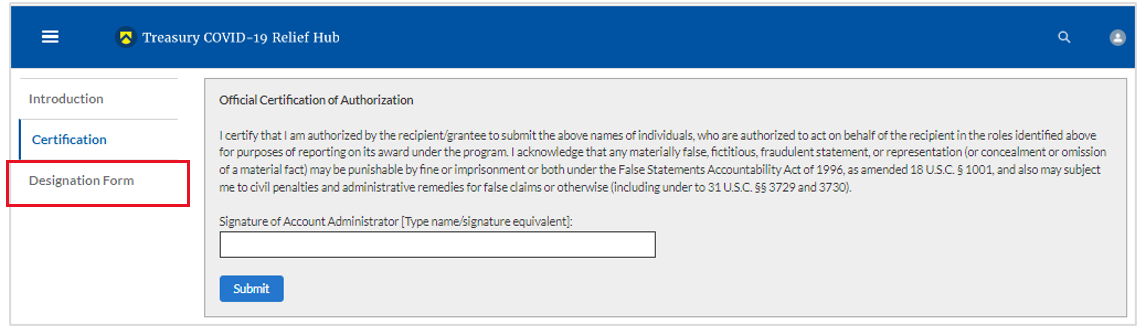 Account Administrator for the SLFRF award has the administrative role of maintaining the names and contact information of the designated individuals for SLFRF reporting. The Account Administrator is also responsible for working within your organization to determine its designees for the roles of Point of Contact for Reporting and Authorized Representative for Reporting and providing their names and contact information via Treasury’s Portal. Finally, the Account Administrator is responsible for making any changes or updates to the user roles as needed over the award period. We recommend that the Account Administrator identify an individual to serve in his/her place in the event of staff changes.