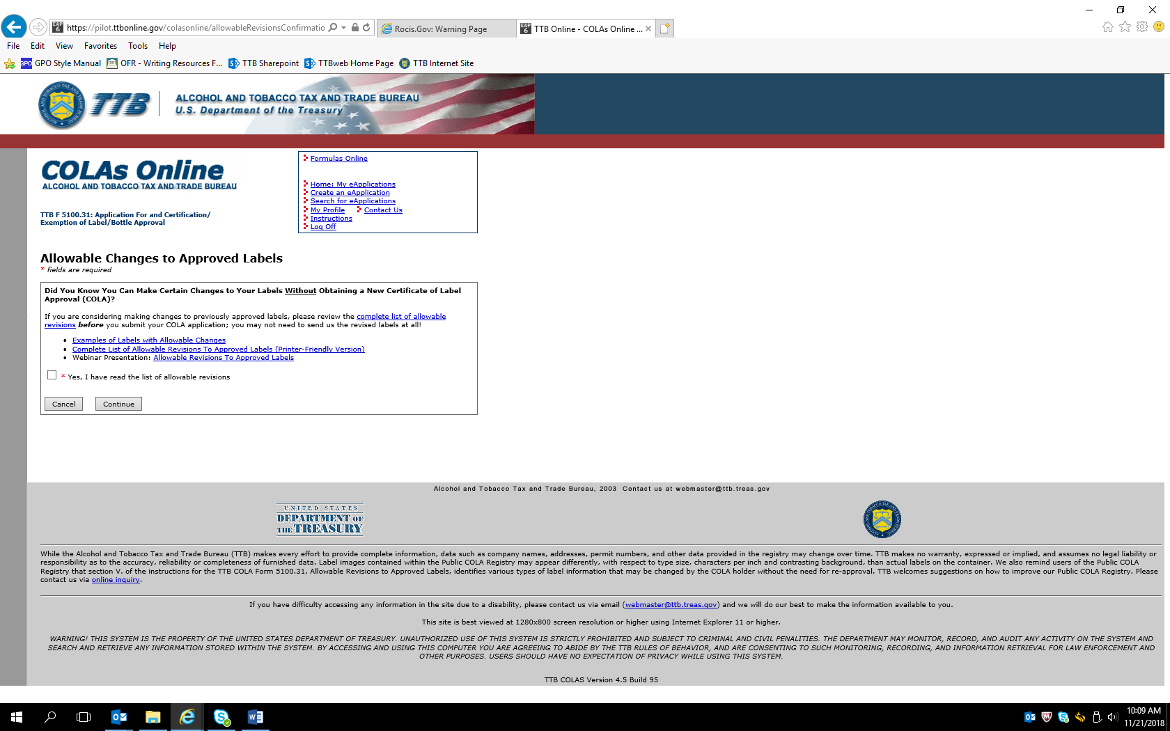 Allowable versions link: https://www.ttb.gov/labeling/allowable_revisions.shtml#completeList. Checking the “Yes, I have read the list of allowable revisions” box and clicking “Continue” results in this page: