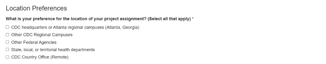 Change Type: Response option revision Other CDC Regional Campuses (Select all that apply): 1. Anchorage, Alaska 2. Ft. Collins, Colorado 3. San Juan, Puerto Rico 4. Hyattsville, Maryland 5. Morgantown, West Virginia 6. Cincinnati, Ohio 7. Pittsburgh, Pennsylvania 8. Spokane, Washington 9. Denver, Colorado 10. Durham, North Carolina 11. Washington, DC 12. I am open to locations not listed above |