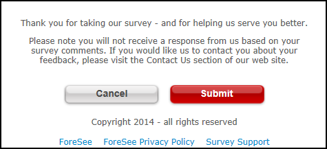 Thank you for taking our survey - and for helping us serve you better. Since all responses are confidential, you will not receive a response from us based on your survey comments. If you would like us to contact you about your feedback, please visit the Contact Us section of our website. |