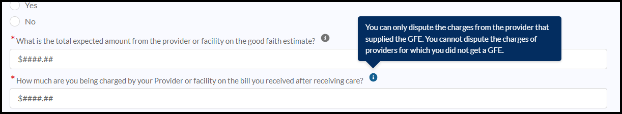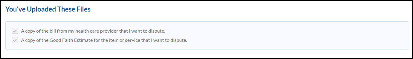 For uninsured or self-pay patients, providers are required to provide an estimate also known as a Good Faith Estimate for medical services. You can only dispute the charges from the provider that supplied the GFE. You cannot dispute the charges of providers for which you did not get a GFE. Upload the Good Faith Estimate that you received.