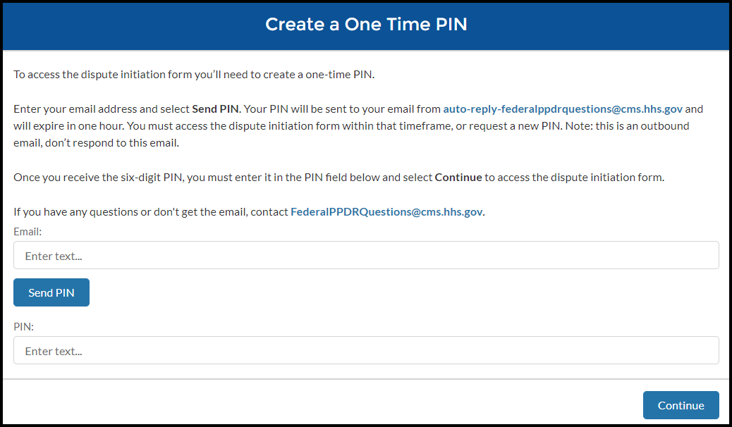 Enter your email address and select Send PIN. Your PIN will be sent to your email from auto-reply-federalppdrquestions@cms.hhs.gov and will expire in one hour. You must access the dispute initiation form within that timeframe, or request a new PIN. Note: this is an outbound email, don’t respond to this email.