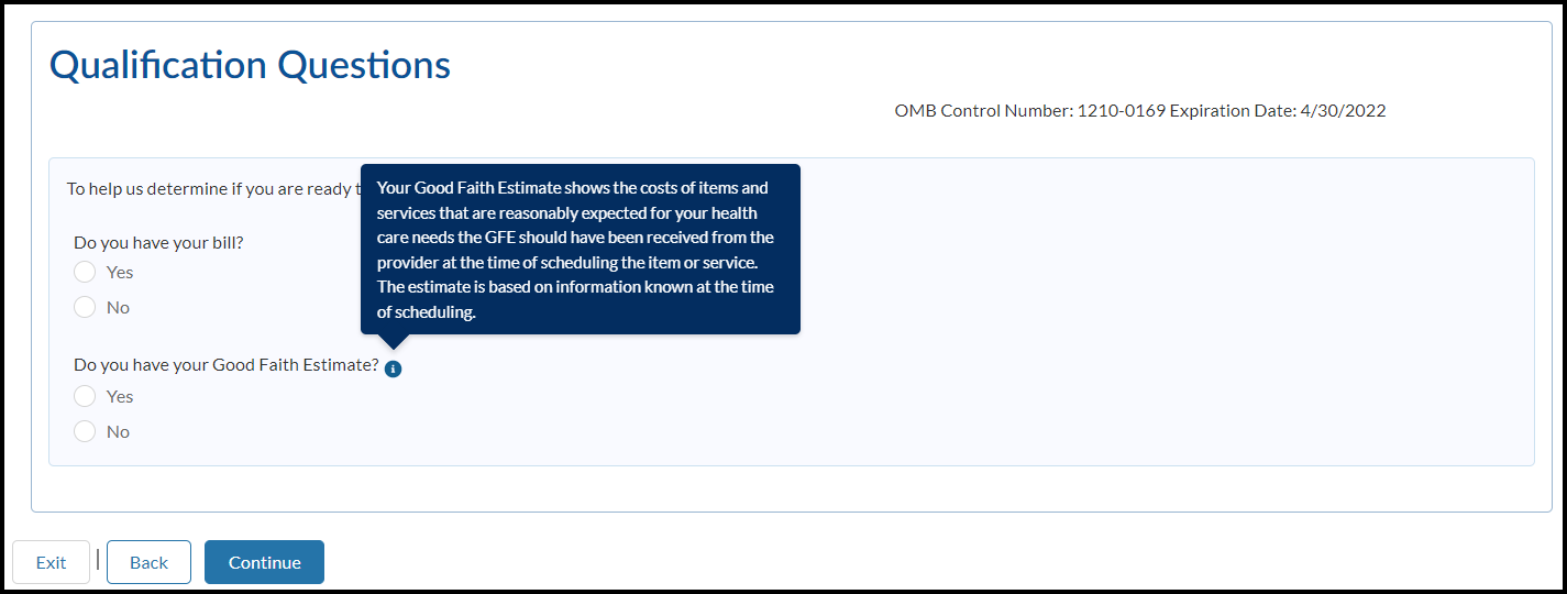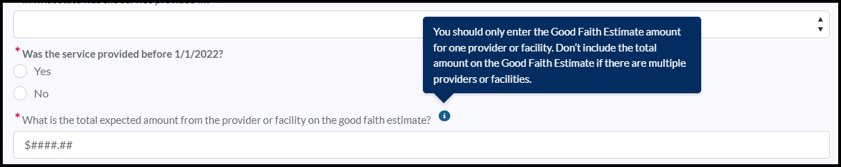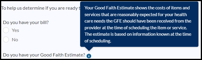 (Good Faith Estimate information bubble) Your Good Faith Estimate shows the costs of items and services that are reasonably expected for your health care needs and you should’ve received one from the provider at the time of scheduling the item or service. The estimate is based on information known at the time of scheduling.