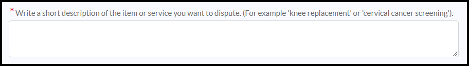 *Write a short description of the item or service you want to dispute. (For example, "knee replacement" or "cervical cancer screening")