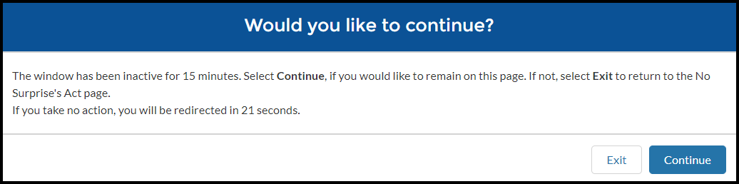 The window has been inactive for 15 minutes. Select Continue if you would like to remain on this page. If not, select Exit to return to the No Surprise’s Act page. If you take no action, you will be redirected in 21 seconds.