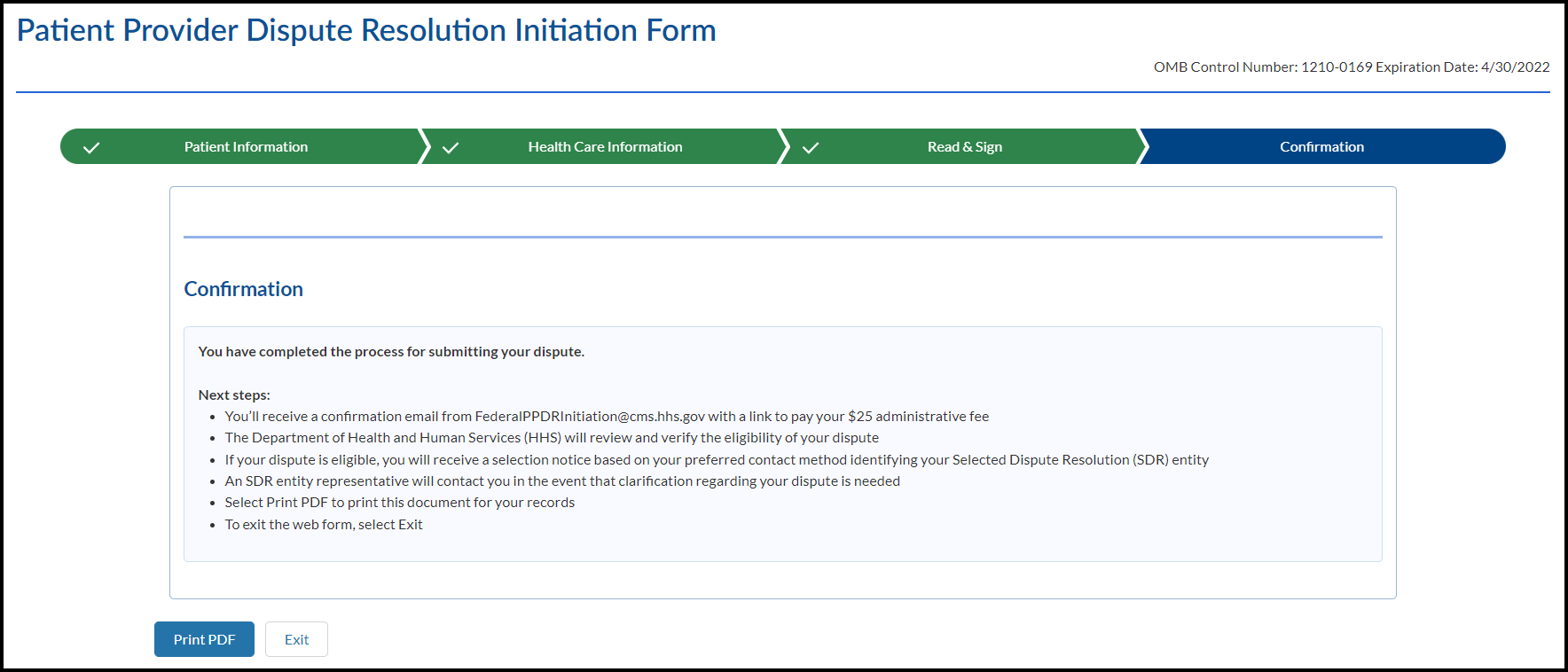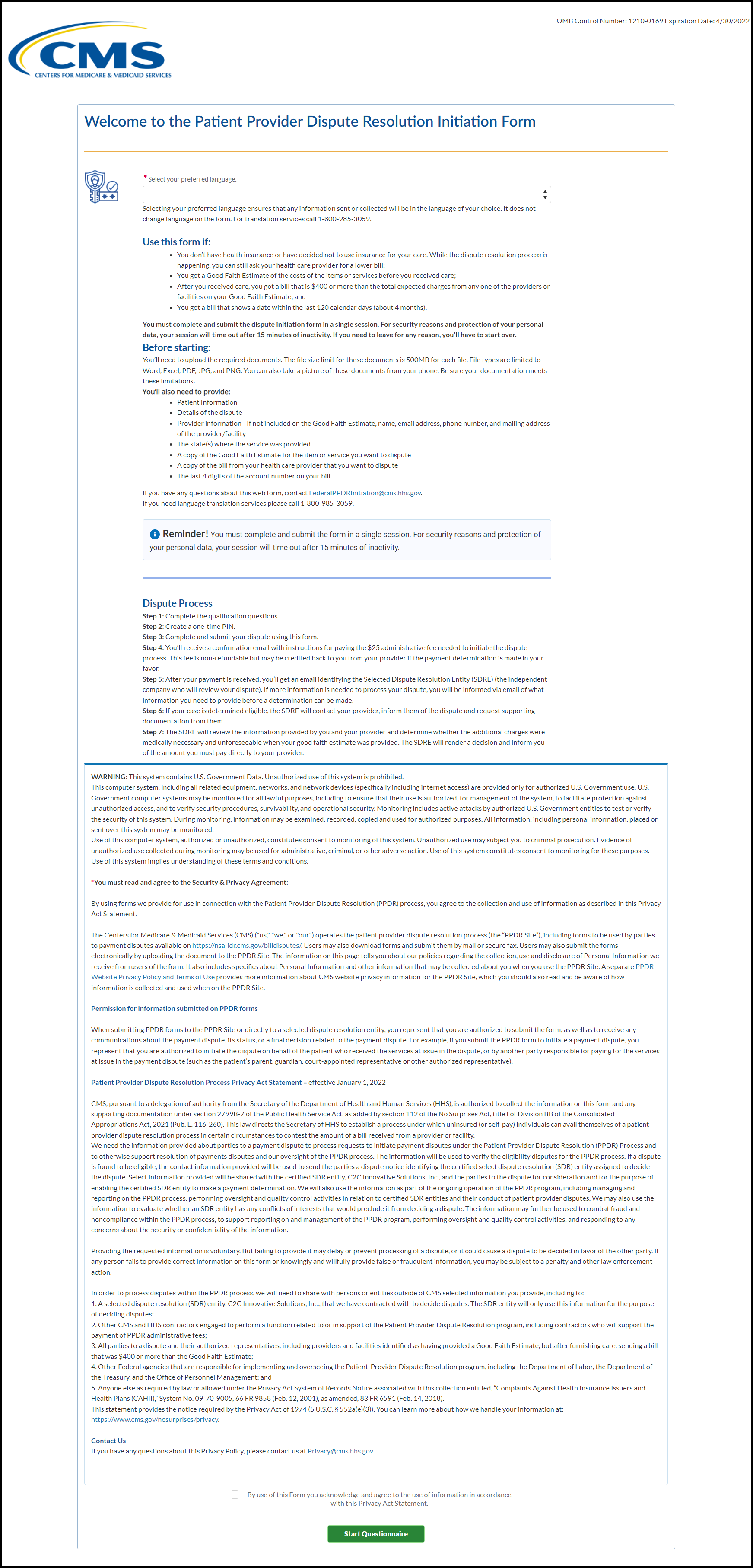 The Centers for Medicare & Medicaid Services (CMS) ("us," "we," or "our") operates the patient provider dispute resolution process (the “PPDR Site”), including forms to be used by parties to payment disputes available on https://nsa-idr.cms.gov/billdisputes/. Users may also download forms and submit them by mail or secure fax. Users may also submit the forms electronically by uploading the document to the PPDR Site. The information on this page tells you about our policies regarding the collection, use and disclosure of Personal Information we receive from users of the form. It also includes specifics about Personal Information and other information that may be collected about you when you use the PPDR Site. A separate [PPDR Website Privacy Policy and Terms of Use] provides more information about CMS website privacy information for the PPDR Site, which you should also read and be aware of how information is collected and used when on the PPDR Site.