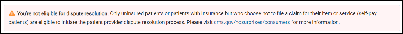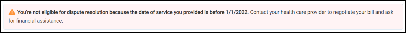 ou’re not eligible for dispute resolution because the date of service you provided is before 1/1/2022. Contact your health care provider to negotiate your bill and ask for financial assistance.