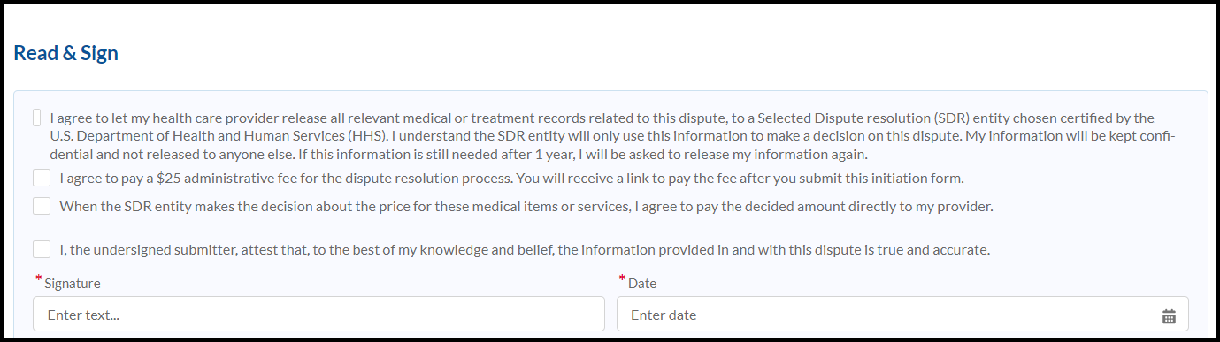 • I agree to let my health care provider release all relevant medical or treatment records related to this dispute, to a Selected Dispute Resolution (SDR) entity chosen and certified by the U.S. Department of Health and Human Services (HHS). I understand the SDR entity will only use this information to make a decision on this dispute. My information will be kept confidential and not released to anyone else. If this information is still needed after 1 year, I will be asked to release my information again.