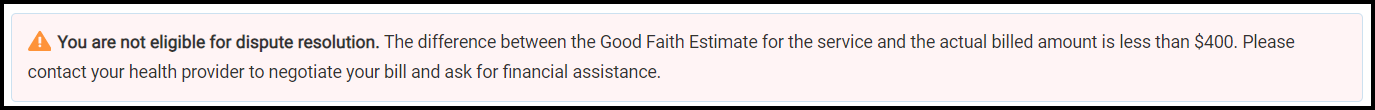 3. You’re not eligible for dispute resolution because the difference between the Good Faith Estimate for the service from the provider or facility and the actual billed amount is less than $400. Contact your health care provider to negotiate your bill or ask for financial assistance.