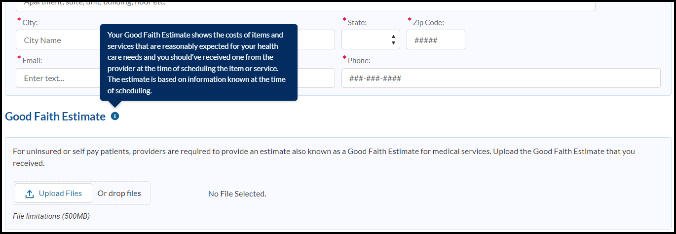 • Provider information - If not included on the Good Faith Estimate, name, email address, phone number, and mailing address of the provider/facility