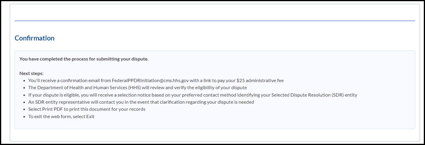 When submitting PPDR forms to the PPDR Site or directly to a selected dispute resolution entity, you represent that you are authorized to submit the form, as well as to receive any communications about the payment dispute, its status, or a final decision related to the payment dispute. For example, if you submit the PPDR form to initiate a payment dispute, you represent that you are authorized to initiate the dispute on behalf of the patient who received the services at issue in the dispute, or by another party responsible for paying for the services at issue in the payment dispute (such as the patient’s parent, guardian, court-appointed representative or other authorized representative).