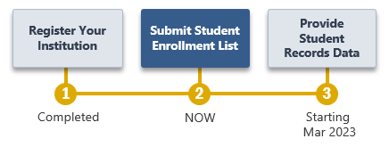 The next step for NPSAS:24 is to submit a list of all students enrolled at your institution who are eligible for NPSAS:24. For the NPSAS:24 field test, this list will include all eligible students enrolled between July 1, 2022 and December 31, 2022, or between July 1, 2022 and April 30, 2023, depending on your institution’s term structure. |