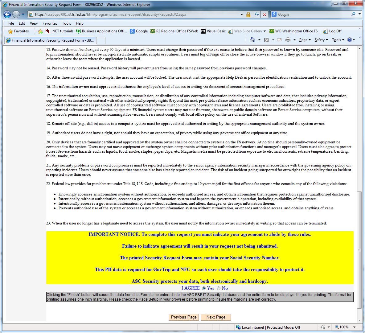 The finished form is displayed, with the Request ID included. The user clicks on the “Click here to Print” link in the top left corner, to print a hard copy of the form for them to sign and have their supervisor sign. The hard copy form (displayed on the following 2 pages) is then faxed to the Forest Service’s Albuquerque Service Center Budget and Finance’s Security group, who will log the fax as being received and who will do the requested action as long as signatures are present. These forms are then maintained electronically for audit purposes.