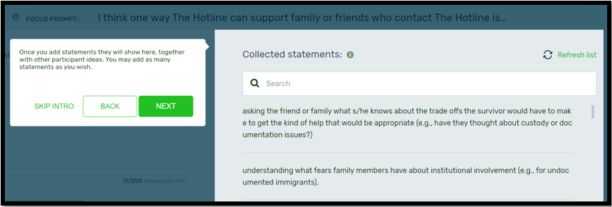 * Instructions in screenshot: “Type a statement here that completes the sentence started above. Please keep each statement brief and include just one thought per statement.” NOTE: All example statements shown under “Collected statements” in the screen shot below will be removed before data collection. Actual brainstormed statements (from participants, the literature review, and advocate interviews) will be viewable by participants should they wish to see examples.
