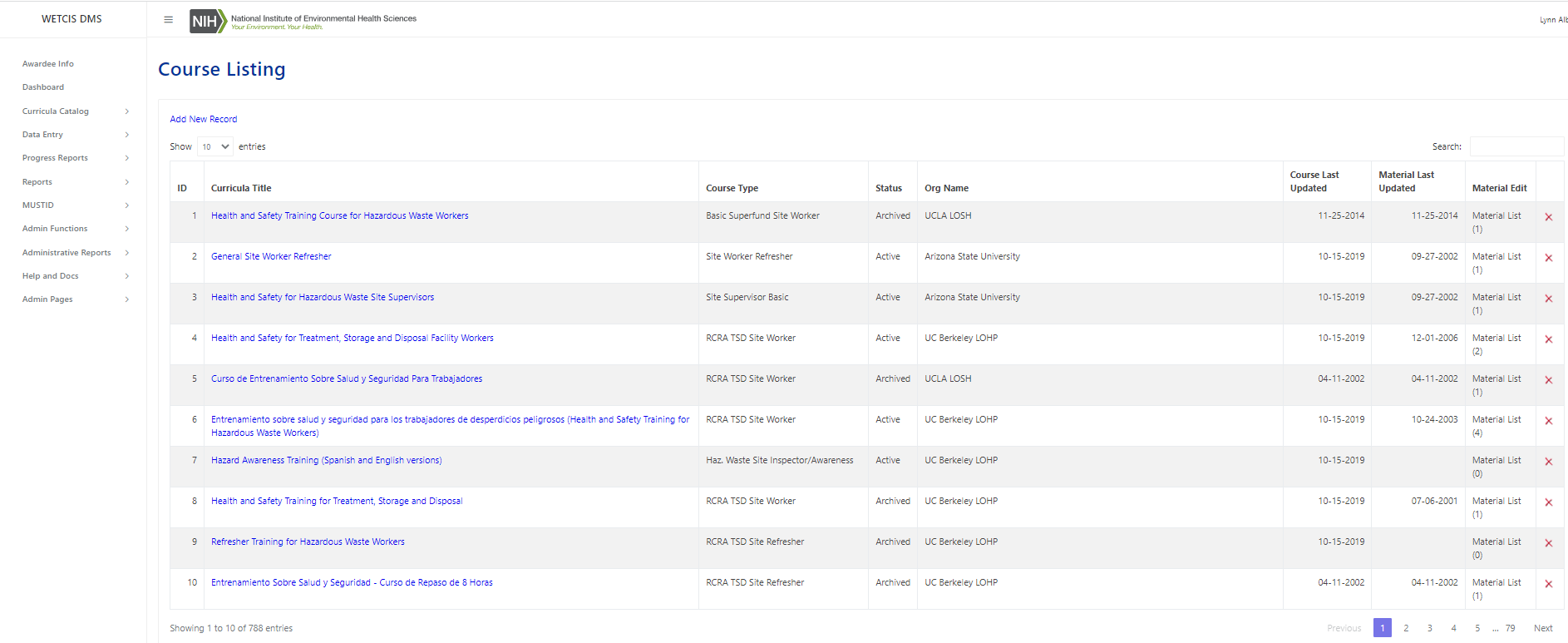 Curricula Catalog: Provides access to training curricula produced by organizations funded by the WTP. This option includes uploading and editing course curricula and materials and adding and editing curricula data coordinator information. The information in the Curricula Catalog is accessed by the public on the National Clearinghouse for Worker Safety and Health Training webpage.