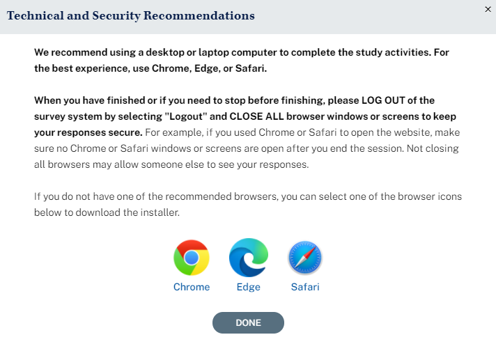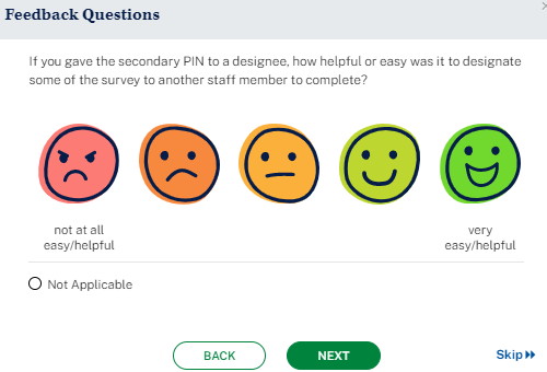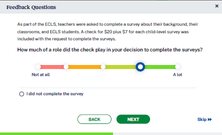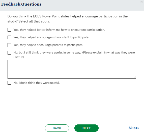 Note that, for all feedback questions, if the next button is selected without selecting a response or ‘skip,’ the following message displays:
