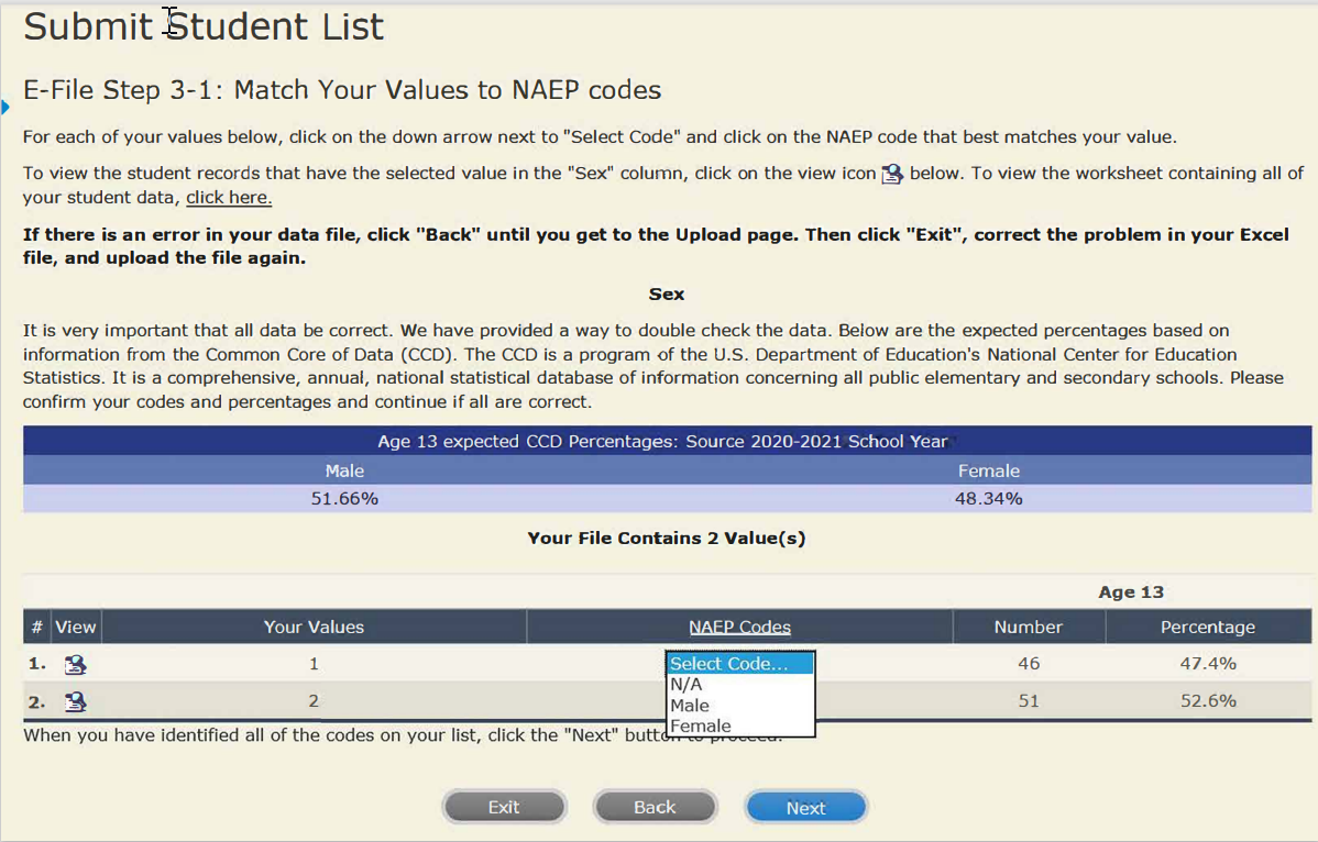 Shown below is an example of row mapping. You need to match the values in each of your columns to the NAEP codes (in drop-down). Once you map a value, select “Next” to move to the next value.