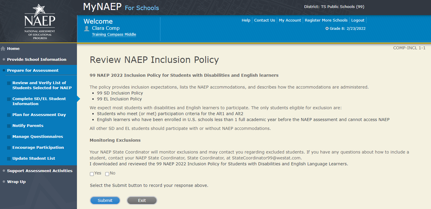 NCES estimates the time required to complete this information collection to average 270 minutes for schools that do not submit student sample information or 390 minutes for schools that submit student sample information manually, plus an additional 10 minutes for each student identified as SD or EL, including the time to review instructions, search existing data resources, gather the data needed, and complete and review the information collection. This voluntary information collection was reviewed and approved by OMB (Control No. 1850-0928). If you have any comments concerning the accuracy of the time estimate, suggestions for improving this collection, or any comments or concerns regarding the status of your individual submission, please write to: National Assessment of Educational Progress (NAEP), National Center for Education Statistics (NCES), Potomac Center Plaza, 550 12th St., SW, 4th floor, Washington, DC 20202, or send an email to: nces.information.collections@ed.gov.
