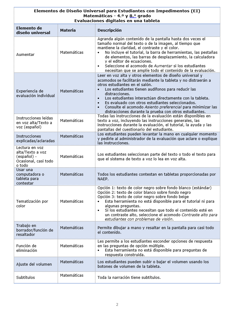 Es preferible que el lugar de la evaluación sea un salón en el primer piso o un salón al que se puede acceder por ascensor, debido a que los representantes de NAEP llevarán equipos pesados.