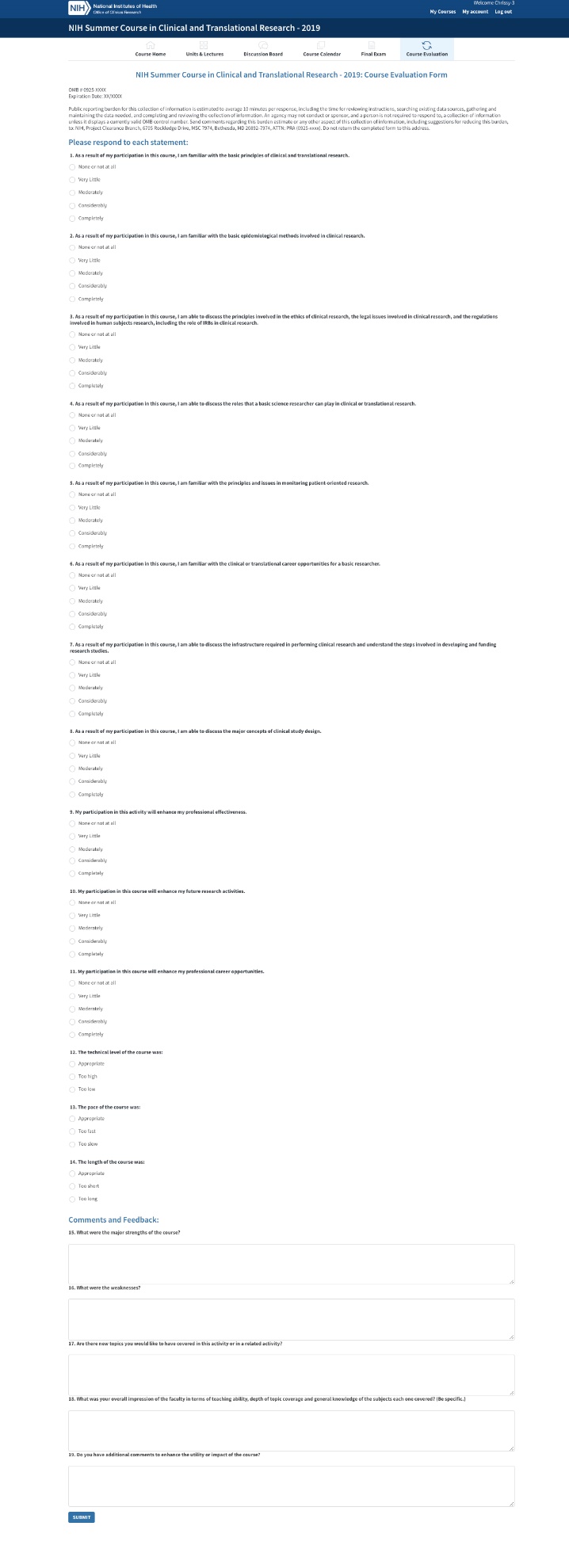 NIH Summer Course in Clinical and Translational Research Course Evaluation Screenshot