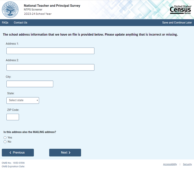 NOTE: Address fields are pre-filled with the sampled school’s information; however, only the address fields (not school name) can be edited on this page.