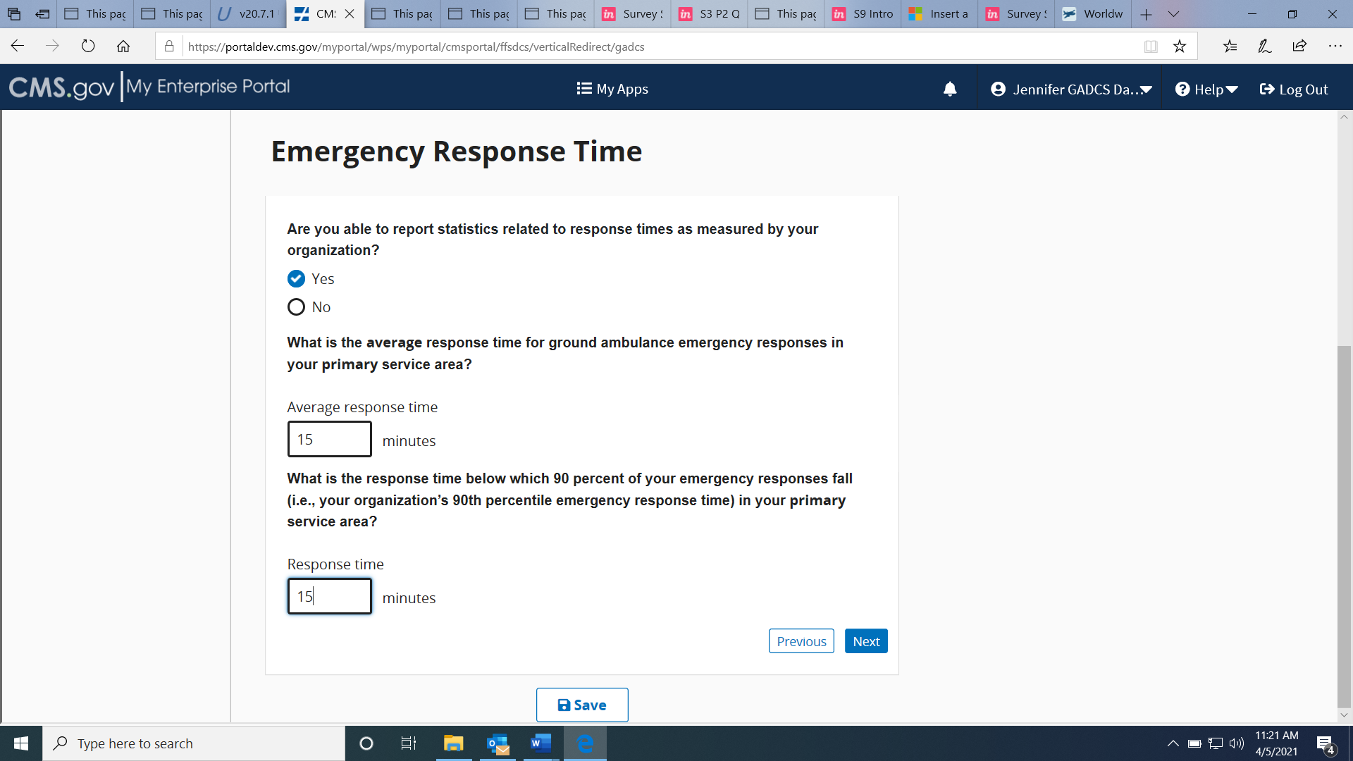 This is an example of the questions if you select Yes where you will be asked to record the average response time in MINUTES for your primary service area.