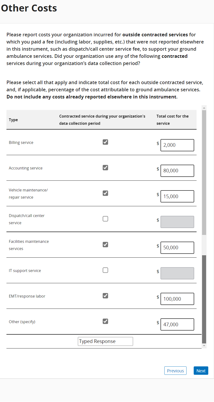 Once you’ve completed entering information about ground ambulance vehicle costs, you will be asked about your organization’s non-ambulance vehicles.