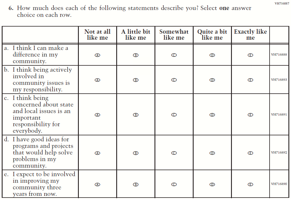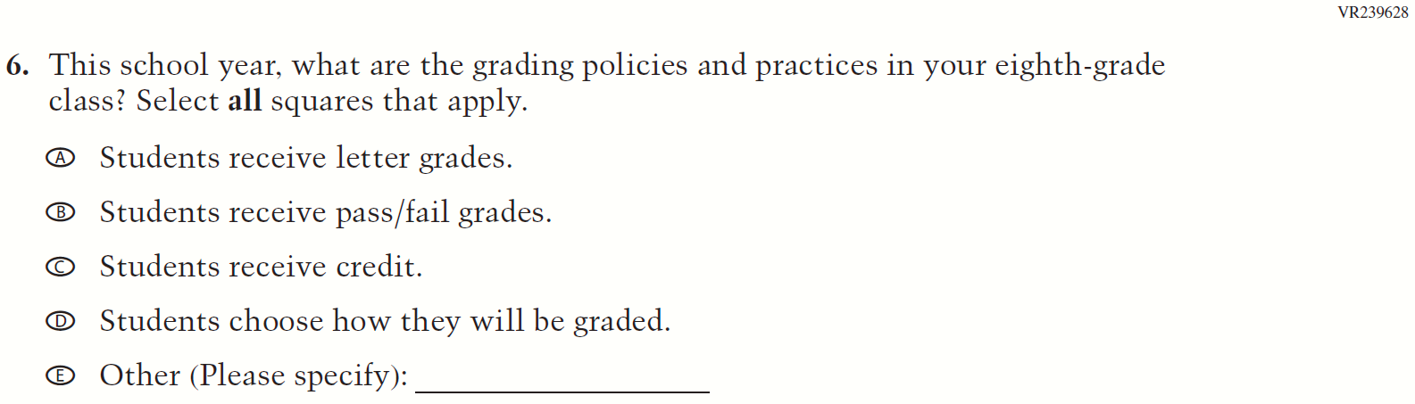 This Appendix F provides the library of previously cleared items that may be used in the NAEP 2024 questionnaires. Non-substantive wording changes to the questionnaire items (based on ongoing and future cognitive and pilot testing results), if any will be made, along with the final selection of which items will be used in the final versions of the NAEP 2024 questionnaires, will be provided as outlined below. The number of items selected for each type of respondent will be appropriate to the allocated time (as indicated in the Supporting Statement Part A section A.12).