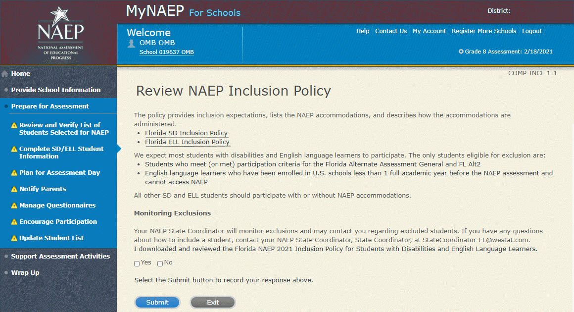 According to the Paperwork Reduction Act of 1995, no persons are required to respond to a collection of information unless it displays a valid OMB control number. The valid OMB control number for this voluntary information collection is 1850-0928. The time required to complete this information collection is estimated to average 270 minutes for schools that do not submit student sample information or 390 minutes for schools that submit student sample information manually, plus an additional 10 minutes for each student identified as SD or ELL, including the time to review instructions, search existing data resources, gather the data needed, and complete and review the information collection. If you have any comments concerning the accuracy of the time estimate, suggestions for improving this collection, or any comments or concerns regarding the status of your individual submission, please write to: National Assessment of Educational Progress (NAEP), National Center for Education Statistics (NCES), Potomac Center Plaza, 550 12th St., SW, 4th floor, Washington, DC 20202.