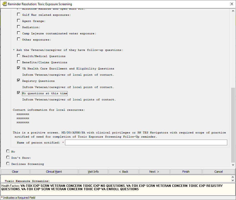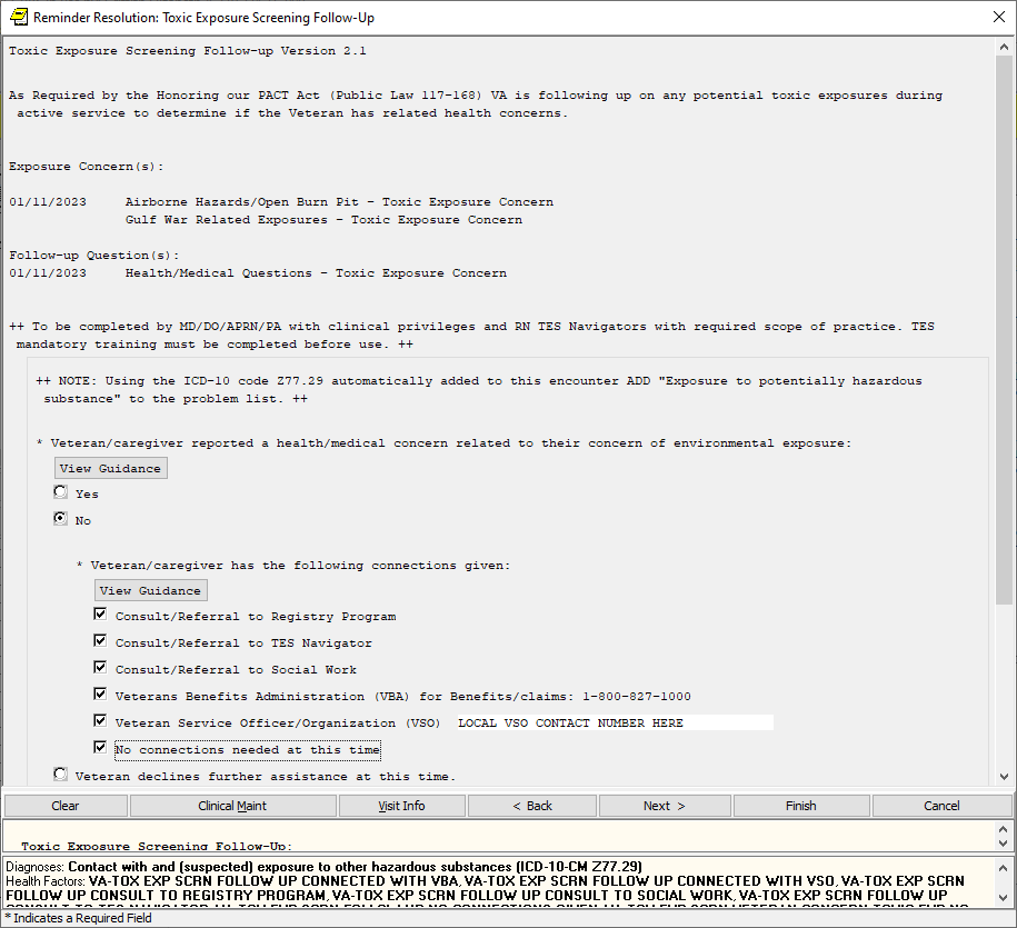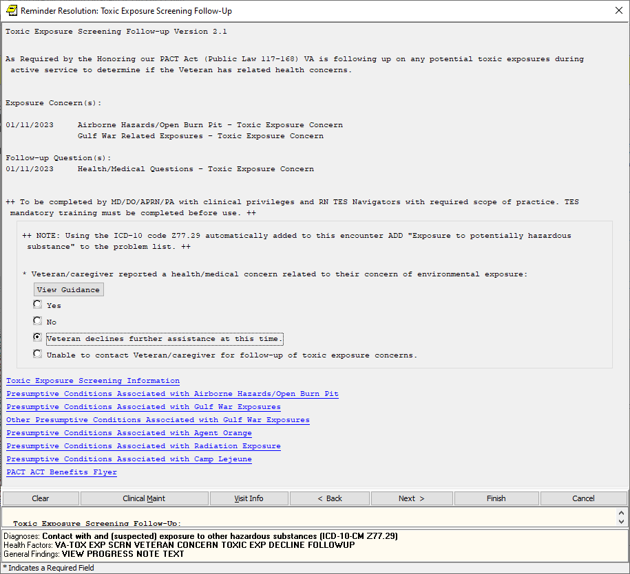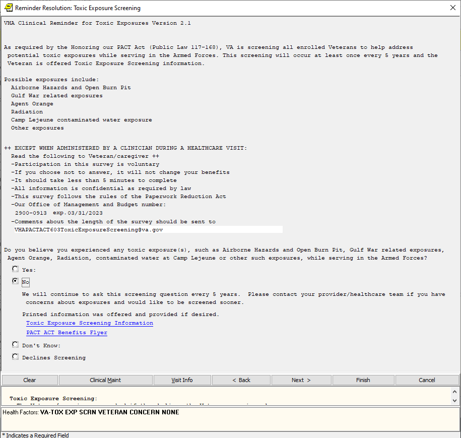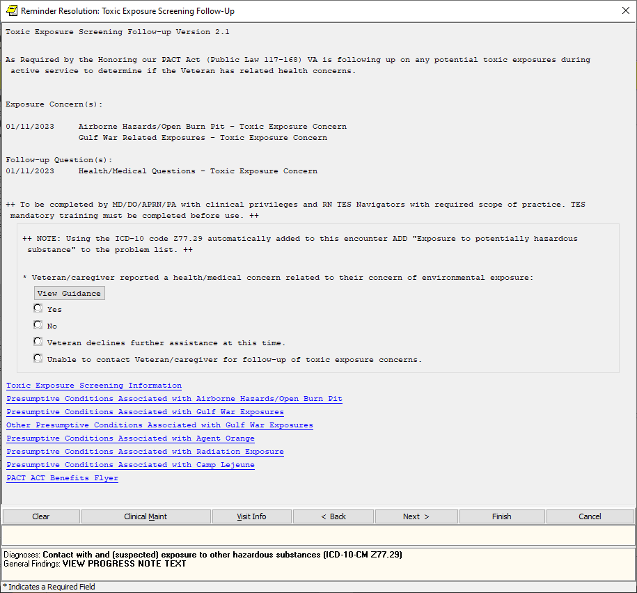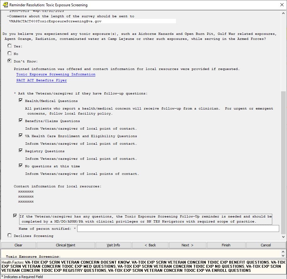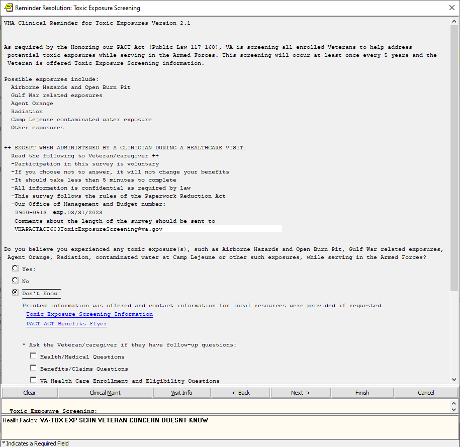 If the screen is completed by a user that is not a PA/APRN/MD/DO and the screen response is YES or if the screen response is DON’T KNOW and the Veteran has any questions, the follow up reminder will come due.