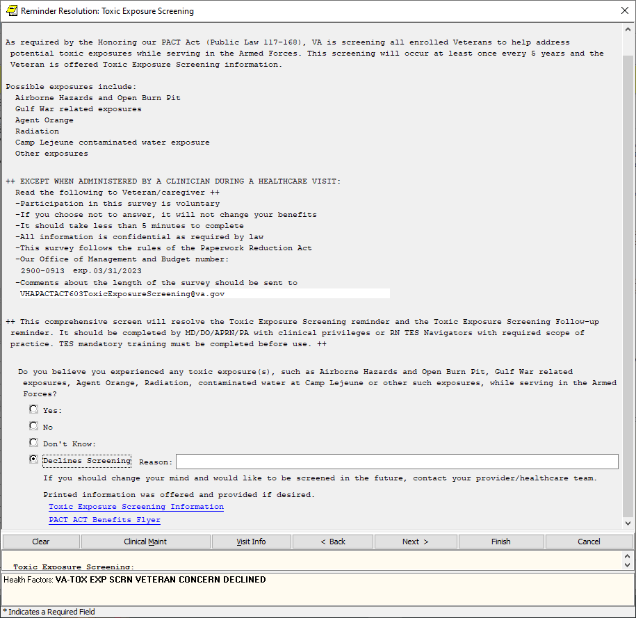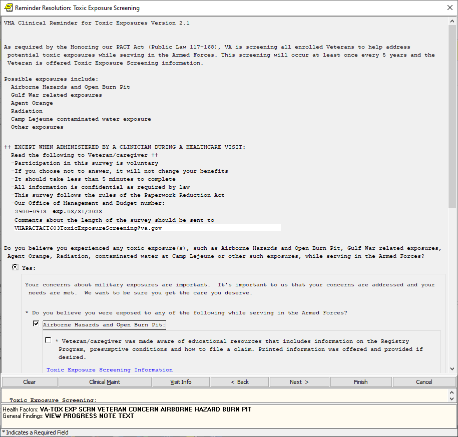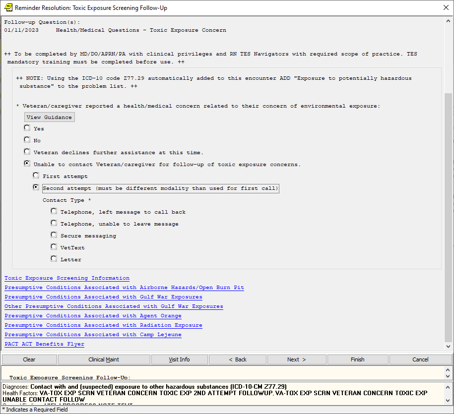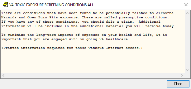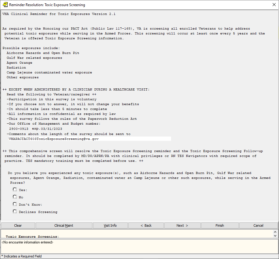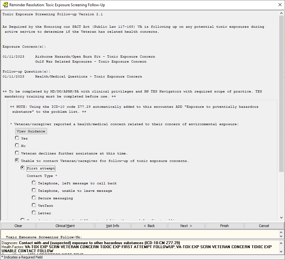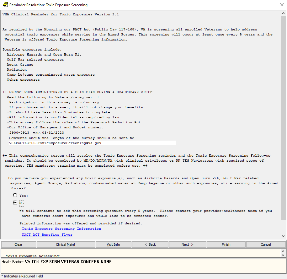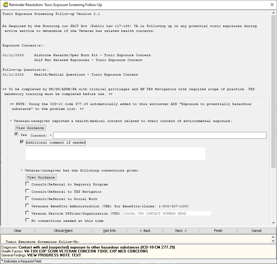 If the screen is completed by a user that is not a PA/APRN/MD/DO and the screen response is YES or if the screen response is DON’T KNOW and the Veteran has any questions, the follow up reminder will come due.