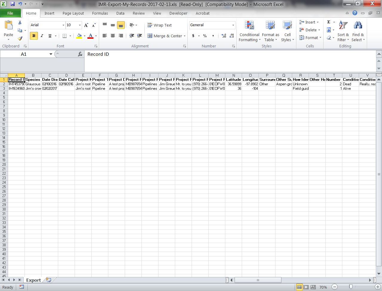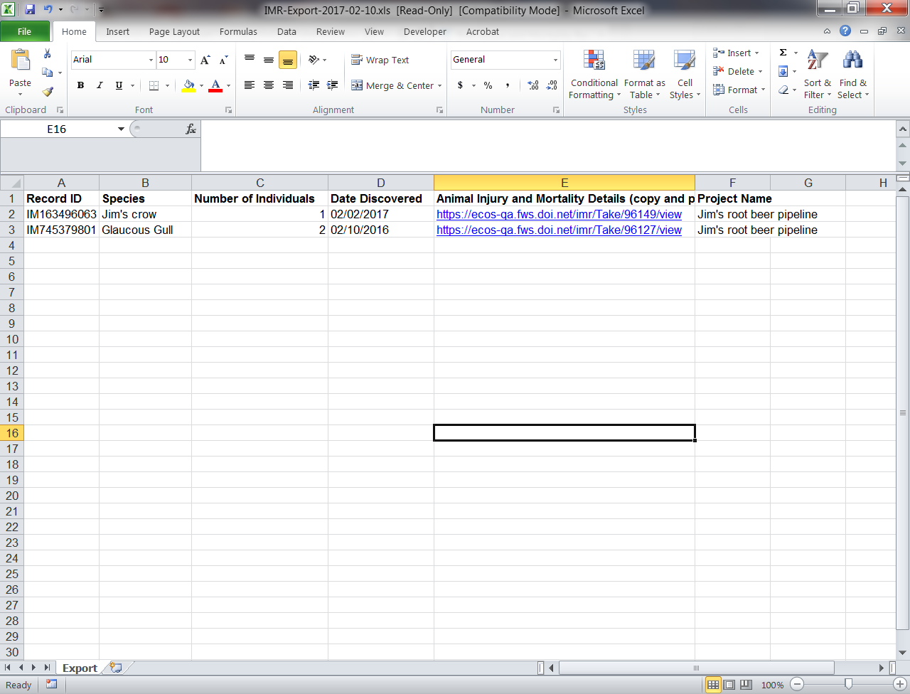 The Excel version of the summary is formatted as pictured below. Anyone listed as a Project User on the project can view the full details associated with the record by copying and pasting the hyperlink pictured below in column E into their web browser. The user will be prompted to log into IMR to view the record details: