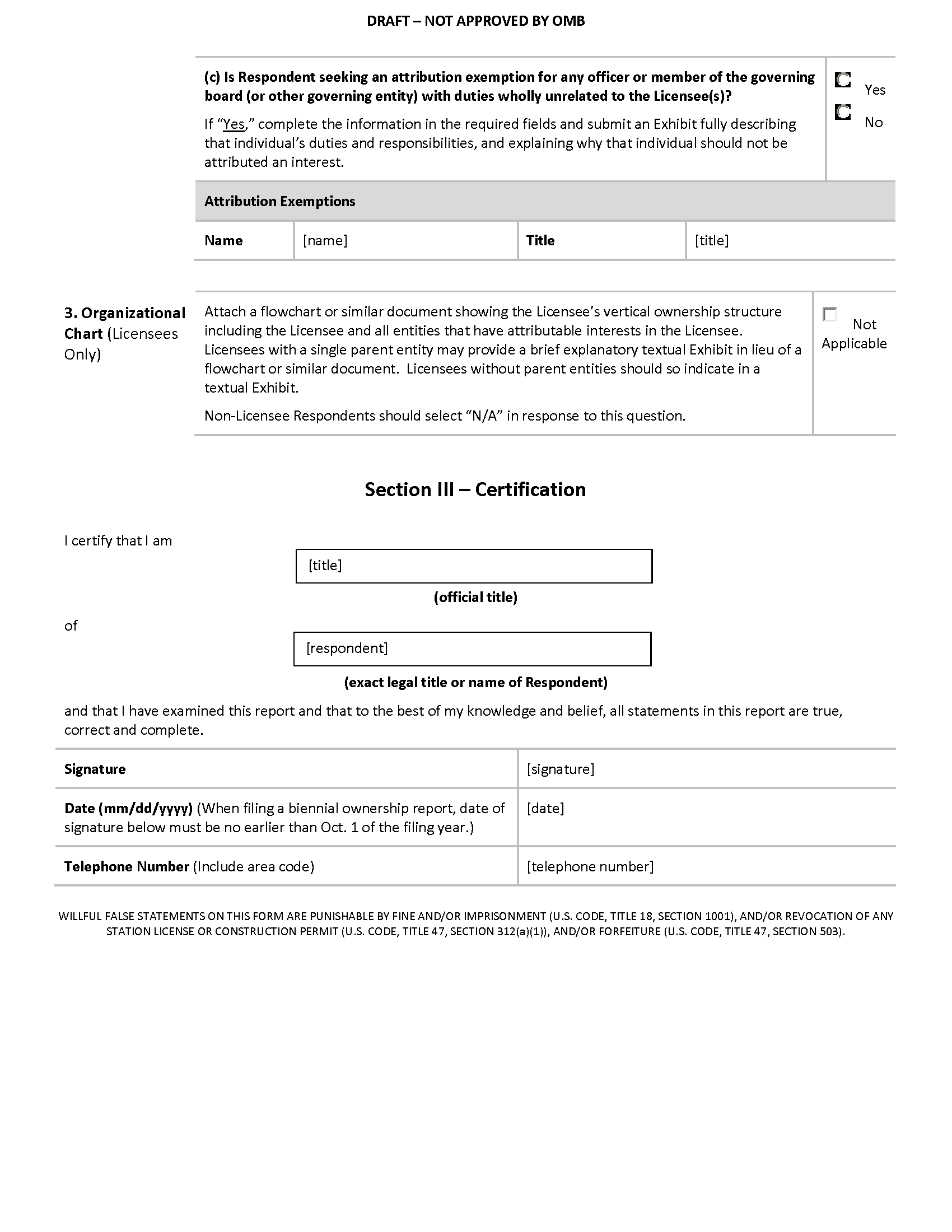 The person certifying the accuracy of the information in this report must be the individual Licensee or Permittee, an appropriate officer or member of the governing board (or other governing entity) of the Licensee or Permittee. If this report is filed for a Respondent that is not a Licensee or Permittee, the person certifying the accuracy of the information must be an appropriate officer or member of the governing board (or other governing entity) of the Respondent. The date of the signature must be no earlier than Oct. 1 of the filing year when filing a biennial ownership report.