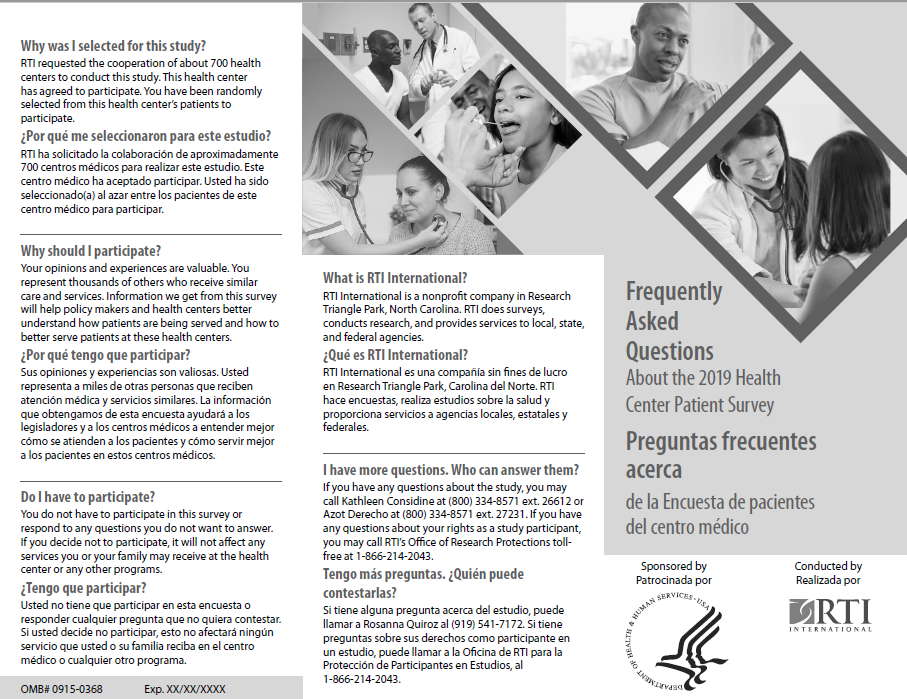 HRSA has selected your health center to assist us in this important work, and we would appreciate your support. Specifically, your staff will be asked to help identify patients willing to be interviewed for the Patient Survey and allow RTI staff to conduct personal interviews with the selected patients.