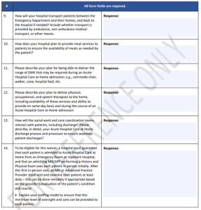 When a hospital submits a waiver request, it completes one of two online forms found on the waiver landing page (https://qualitynet.cms.gov/acute-hospital-care-at-home), depending on its level of experience with this type of care. Experienced hospitals, defined as treating at least 25 patients with acute hospital care at home previously, have an expedited submission that is based on a series of attestations, seen below: