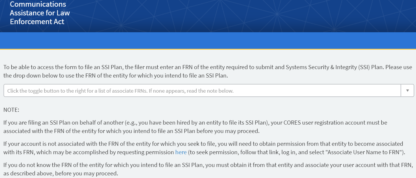 To use CEFS, the FCC User Registration must be associated with the FCC Registration Number (FRN) of the entity for which the SSI Plan is being filed.