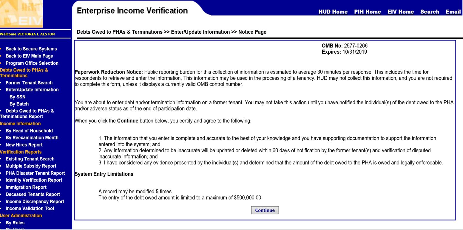 Enterprise Income Verification (EIV) System - Debts owed to Public Housing Agencies and Terminations