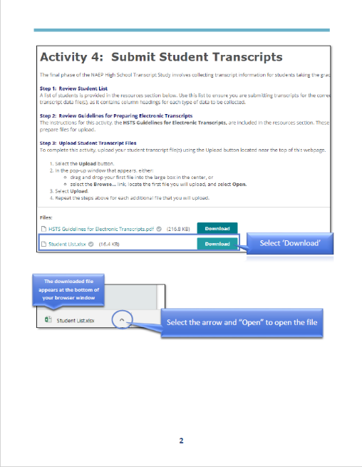 Description of the HSTS Website: The NAEP State and TUDA Coordinators or school HSTS coordinators, depending on how tasks are designated, are responsible for providing information and materials for the study, including course catalogs and student transcripts, using the HSTS website, which is an online secure file-sharing site. The HSTS website serves as the primary resource and action center throughout the data collection period and is provided in this document.