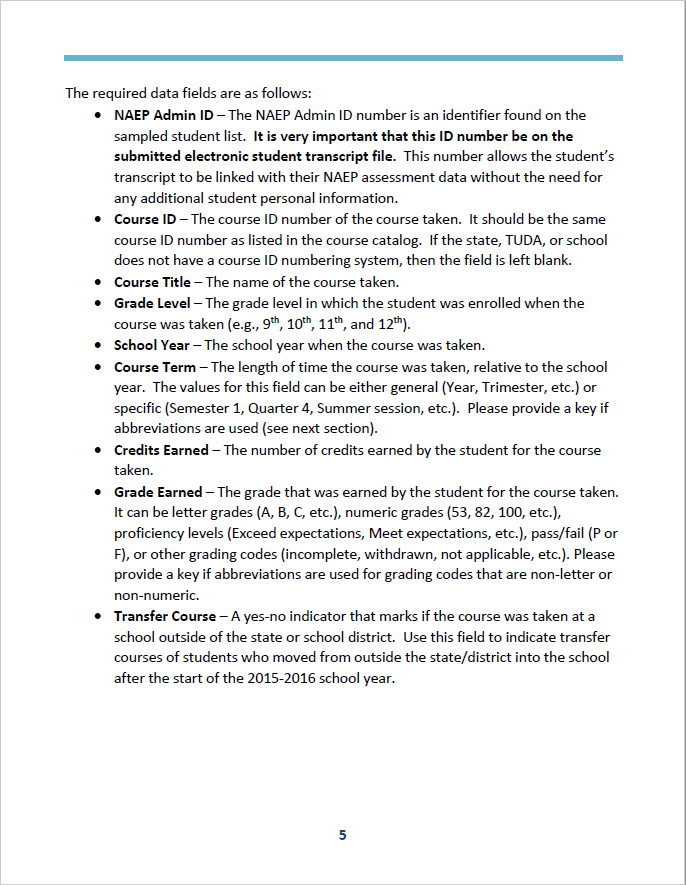 NAEP Admin ID – The NAEP Admin ID number is an identifier found on the sampled student list. It is very important that this ID number be on the submitted electronic student transcript file. This number allows the student’s transcript to be linked with their NAEP assessment data without the need for any additional student personal information.