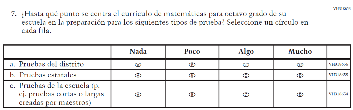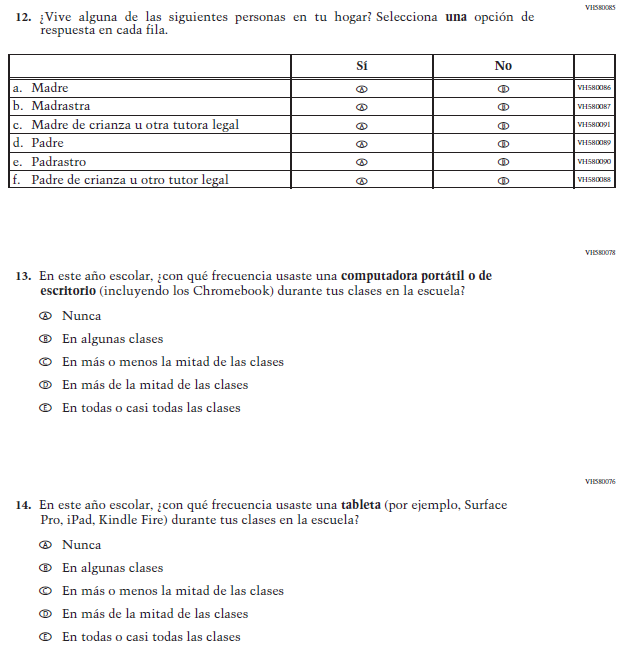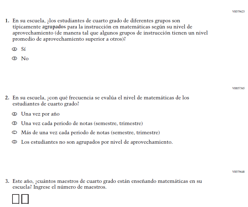 Appendix J-S provides Spanish student, teacher, and school survey questionnaires that will be administered in 2024. Grades 4 and 8 Core, Math, and Reading questionnaires were previously approved in 2022 (OMB# 1850-0928 v.28), and any changes to the items from the 2022 administration are reflected in summary tables. Additionally, grade 8 Science was previously approved in 2019 (OMB# 1850-0928 v.15), and any changes to the items from the 2019 administration are reflected in summary tables. Please note, some of the numbers of the items may be missing or out of order in these printed versions. This will be corrected in the platform view.