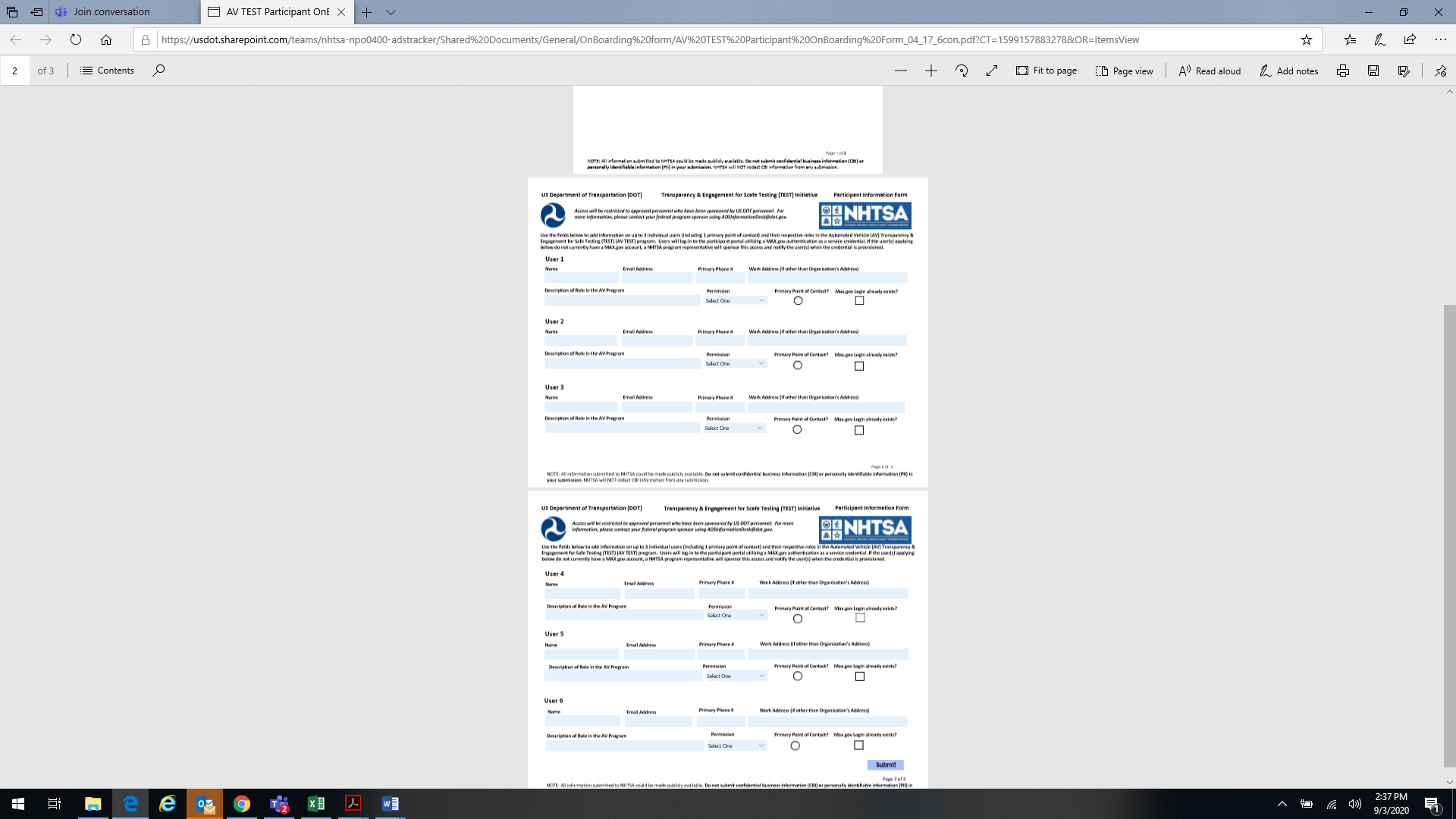 Under the Paperwork Reduction Act, a Federal agency may not conduct or sponsor, and a person is not required to respond to collection of information subject to the requirements of the Paperwork Reduction Act unless that collection of information displays a current valid OMB Control number. The OMB Control Number for this information collection is 2127-NEW (expiration date: MM/DD/YYYY). NHTSA estimates that each State or local participant will spend approximately 30 hours per year providing information to the AV TEST Initiative and estimates that each private industry participant will spend approximately 48 hours per year providing information to the AV TEST Initiative. All responses to this collection of information are voluntary. If you have comments regarding this burden estimate or any other aspect of this collection of information, including suggestions for reducing this burden send them to Information Collection Clearance Officer, National Highway Traffic Safety Administration, 1200 New Jersey Ave, S.E., Washington, DC, 20590.