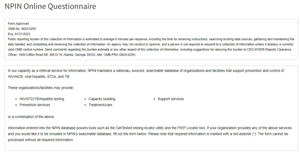NPIN Online Questionnaire for New Organizations