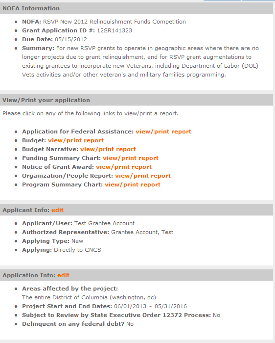 Volume I – Used by applicants for RSVP grants. Instructions within the grant application indicate which sections are required for: