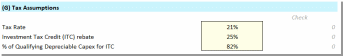 The Tax Assumptions section of the “Assumptions” worksheet contains key assumptions concerning the taxes the project will pay. Importantly, this section also provides a rough example of how to size the benefit of the credit the project could receive from the Advanced Manufacturing Investment Credit (Investment Tax Credit or ITC) under Section 48D of the Internal Revenue Code. The calculations shown below are only an approximation of the tax benefit of the ITC. In the example model the tax benefit is framed as a series of percentages. However, it may be easier for applicants to simply calculate the estimated overall value of the ITC for their projects. This approximation of the tax credit is purely illustrative and is not intended to be, and should not be, relied upon by applicants. The actual application of the ITC will be subject to IRS rules and guidance and the specific applicant and project. Applicants should consult their tax advisors to model the treatment of the ITC based on their individual facts and circumstances. Inputs for this section are as follows: