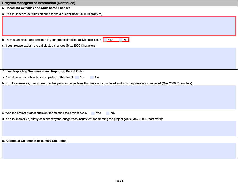 The following pages contain screenshots of the PPR form that grantees are required to use for progress and final reports submitted to FNS. Upon award, a PPR form (Adobe PDF), customized for the specific FNS program, will be included in award packages.