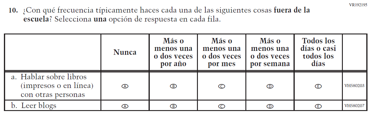 Appendix J-S provides Spanish student, teacher, and school survey questionnaires that will be administered in 2024. Grades 4 and 8 Core, Math, and Reading questionnaires were previously approved in 2022 (OMB# 1850-0928 v.28), and any changes to the items from the 2022 administration are reflected in summary tables. Additionally, grade 8 Science was previously approved in 2019 (OMB# 1850-0928 v.15), and any changes to the items from the 2019 administration are reflected in summary tables. Please note, some of the numbers of the items may be missing or out of order in these printed versions. This will be corrected in the platform view.
